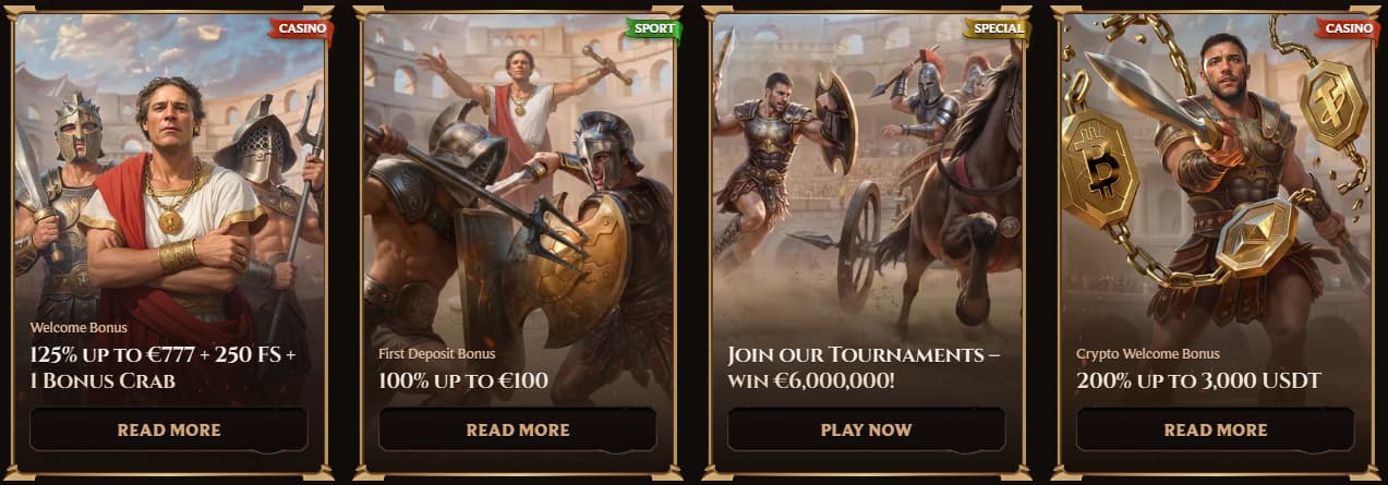 Our main casino welcome offer is 125% up to €777 plus 250 free spins and a Bonus Crab, with clear wagering rules and a 10-day completion window after activation. We also run a separate crypto welcome offer up to 3,000 USDT.